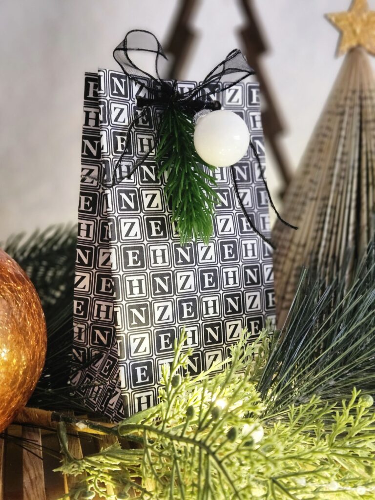 Ich habe nur den Deckel abgeschnitten, den kompletten Tetrapack mit Papier umklebt und ihn dann noch etwas in Form gedrückt. Oben zwei Löcher rein und mit Geschenkband verschlossen.
